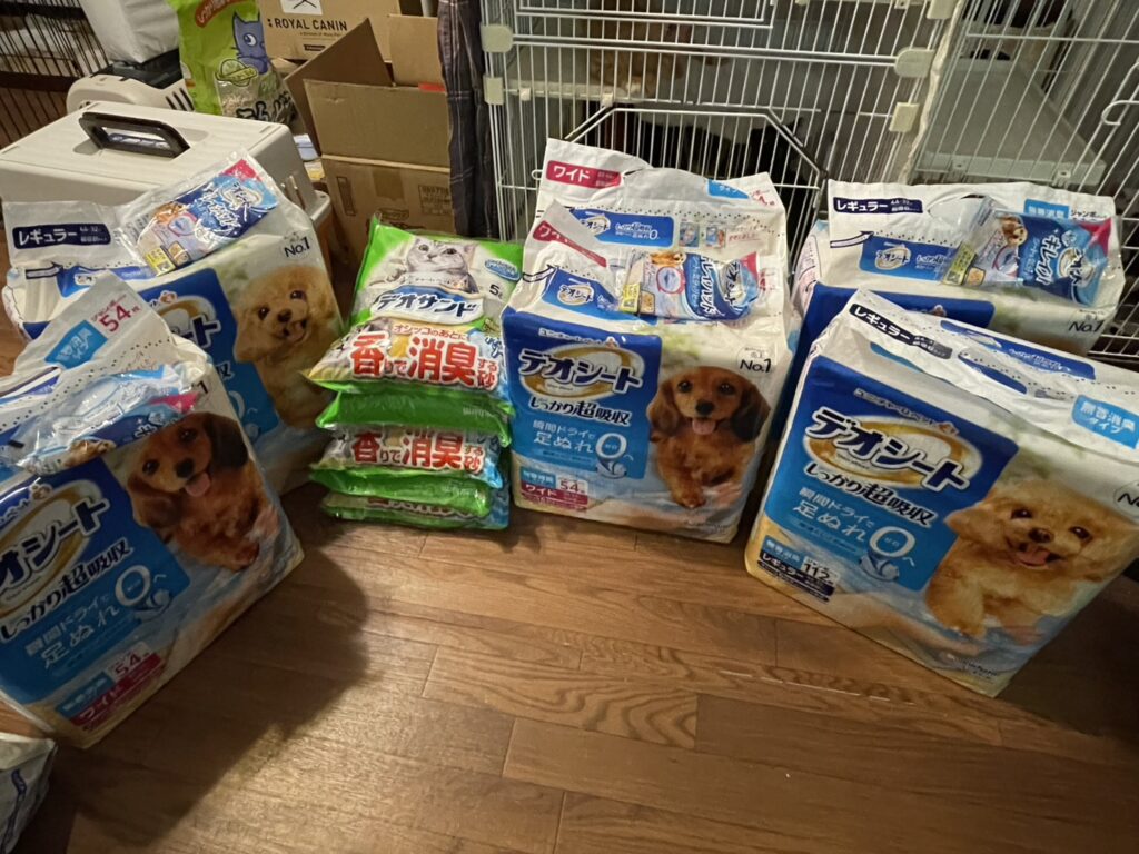 フード、ペットシーツ、猫砂などの